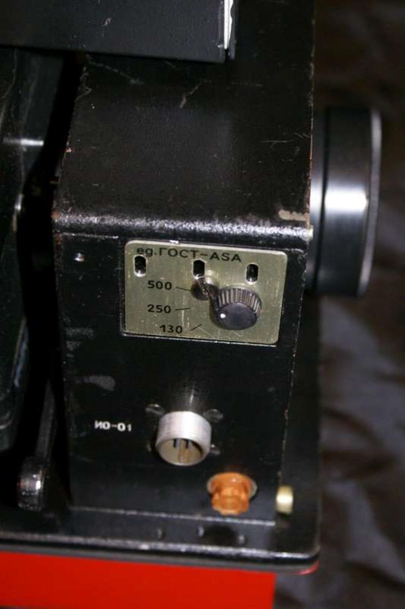 This camera was used by traffic police, I guess. The complete set consist of Selena camera, special film cartridge for 200-300 shots, graded viewfinder etc. All that stuff is placed in quite funny red case with personal number, matching camera number #20018. (sovietcams.com)