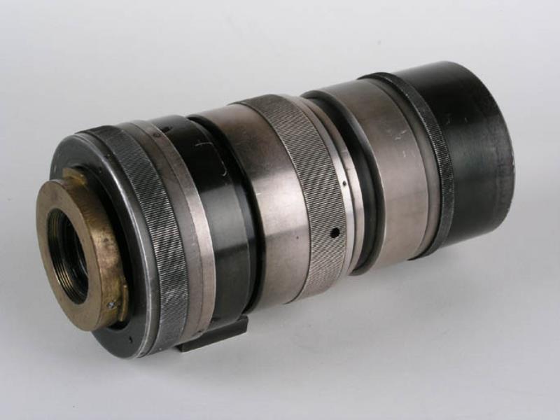 The lens is shown with its original metal lens shade and a brass adaptor for a bayonet mount (unknown) which fits over the original factory M-39 screw mount (probably to fit a Zenit-3 or Kristal camera). The lens is handmade with a milled aluminum body. This lens appears infrequently and probably not many were made.