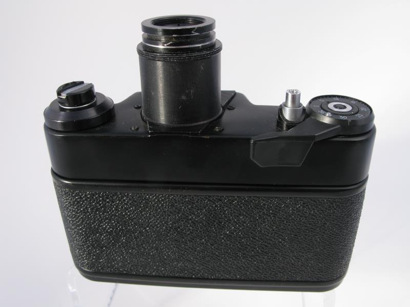 Zenit Labo was produced in the begining of the 1980 years . It was intended for microscope use. It used a Zenit TTL body and some Zenit EM parts and was completly hand built each at a time. Very small production and rare to find. Has no prism. no light meter, no flash synchonizing. no auto diaphagm. Its shutter has only the "B" setting with "soft" mirror lift with cable release and an auxiliary self timer for automatic vibrationless 3 second shutter exposition. Standard M42x1 mount and a 8x focusing loupe in plain ground glass with a center cross. We include four pictures The smaller one was made by KMZ, the three other pictures show a BelOMO production. There are only slight differences: The advance lever typicaly of BelOMO construction (all plastic covered) and two eyelets.