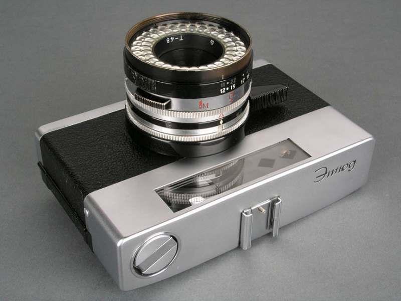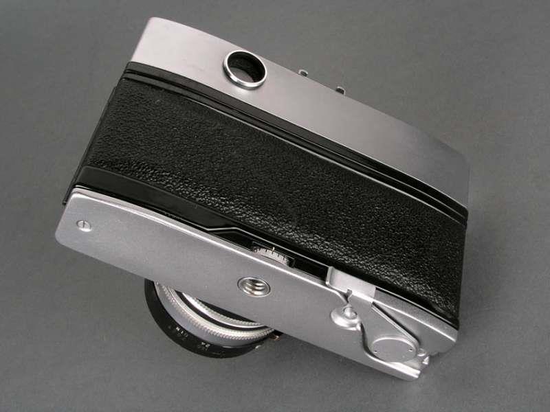 This prototype has the film advance on the bottom of the back, the film counter next to it, and a recessed film rewind knob on the top plate. The shutter release is on the lens (large black-painted metal triangular shape) and the Etude has an automatic central shutter which is coupled to the selenium meter which surrounds the front of lens. The camera has two sets of film speed settings, GOST and DIN, using a ring at the front of the lens. There are three exposure modes, also set by a ring on the lens: Automatic, Flash/Strobe, and "B". When set at "B" the f-stops can be manually adjusted and read through a small window at the top of the lens.