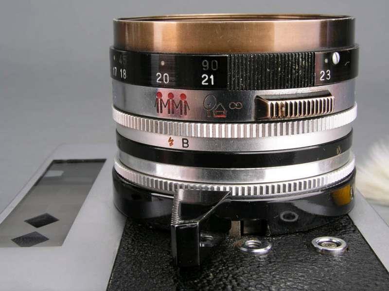 The lens focuses from 1 meter to infinity, and also has figural distance icons on the focusing ring which is mounted on the lens. The camera has a rangefinder with super-imposed images in a central circle of the viewfinder. There is a central bright-line frame with automatic parallax adjustment and extra room around the frame (possibly for an added wide angle lens attachment?). At the top of the viewfinder, above the image frame, there is an exposure indicator that turns green or orange.
