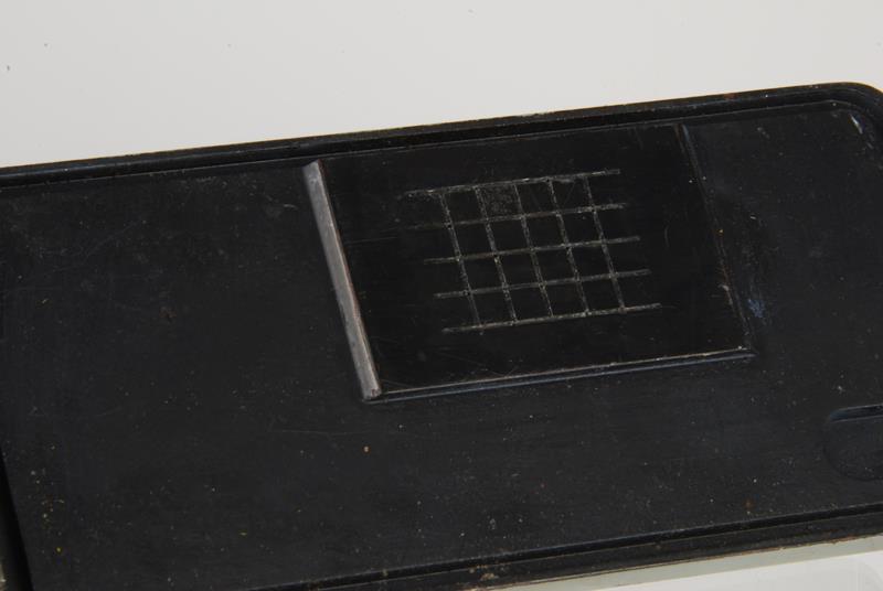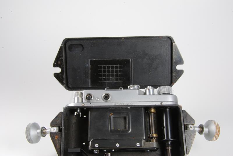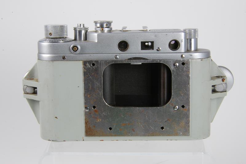 The back plate can be taken off by unscrewing 2 large bolts and swiveling them to the side. The frame mask is very unusual it is 14x14mm. The camera looks like it that it still takes 35mm perforated film but the film advance teeth were ground off except for 2 on top and bottom of it, maybe for the purpose of only advancing it 14mm..