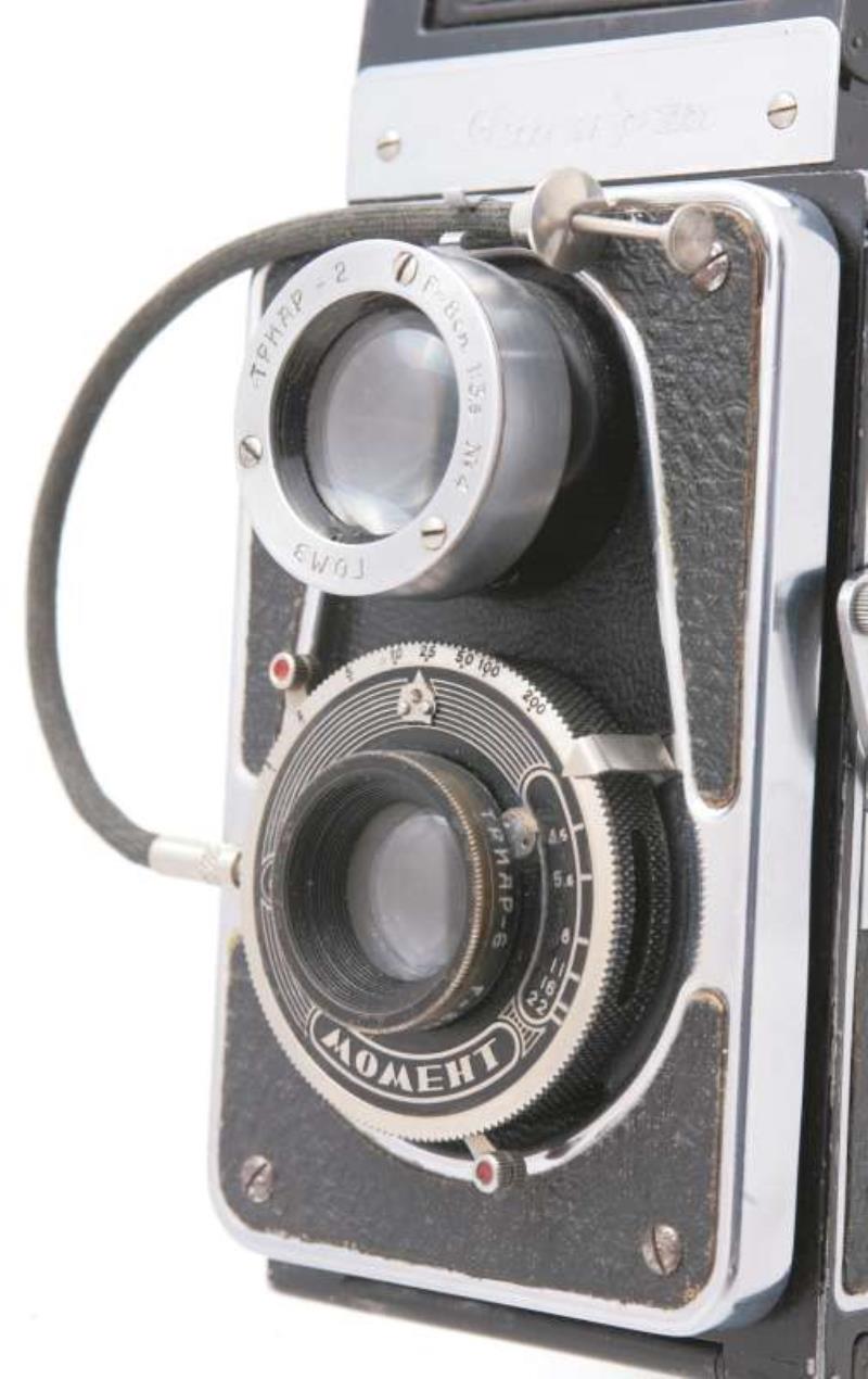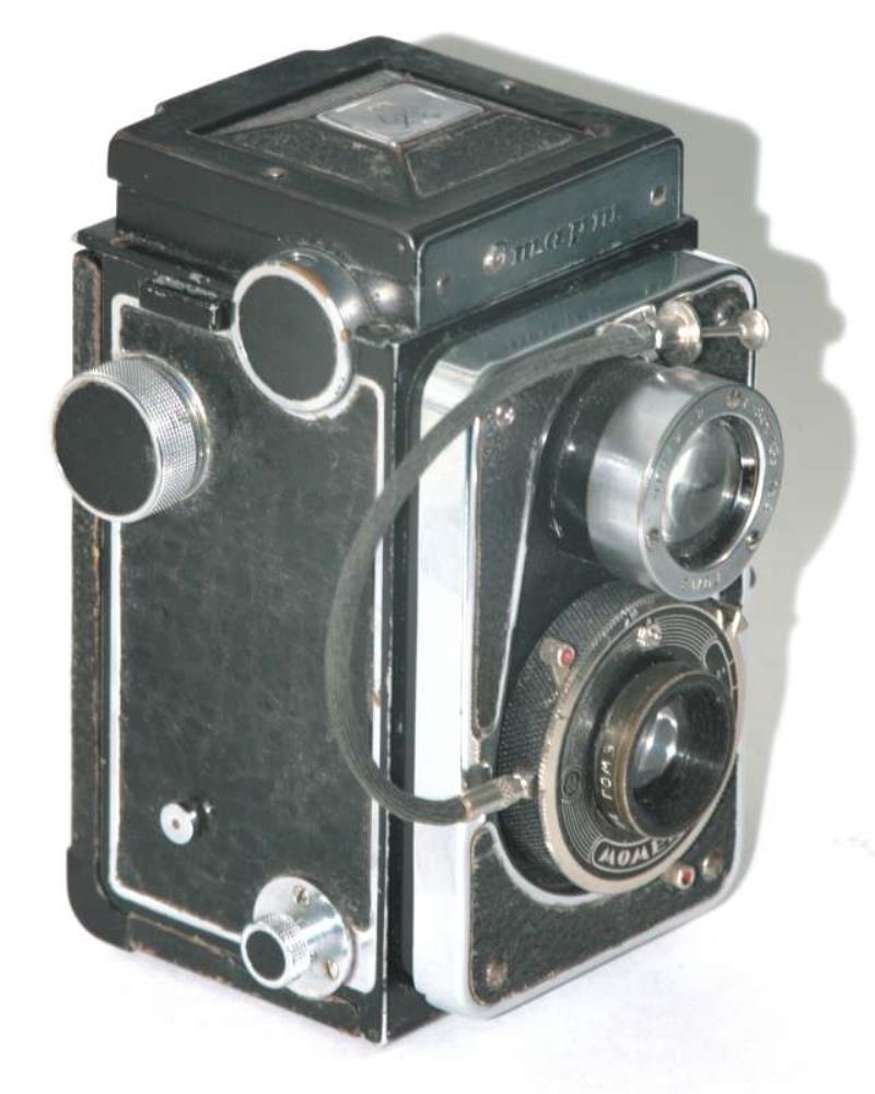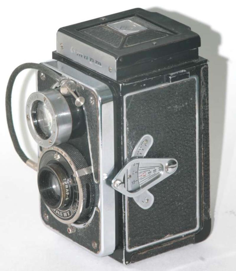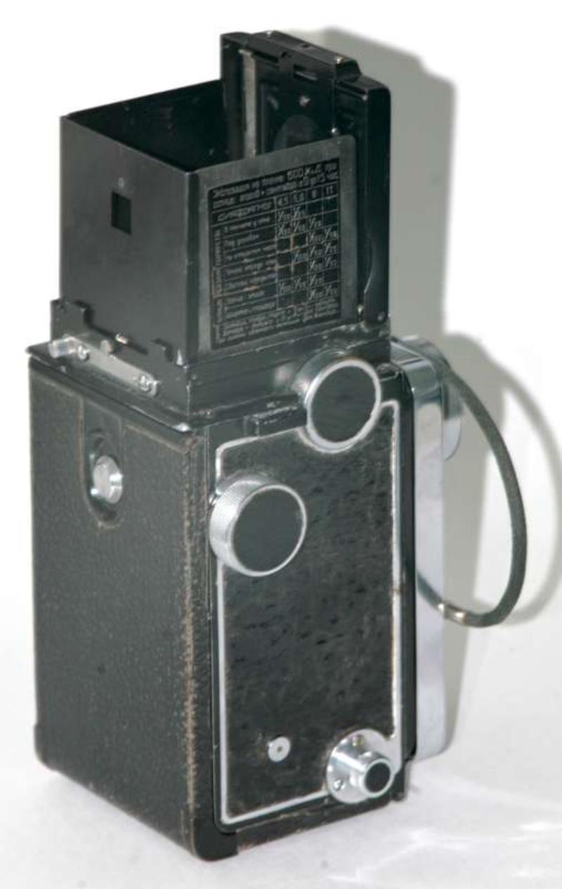 here a TLR camera “Rollei” style whith chromium nameplate: ” Cmapm " in cyrrillics.