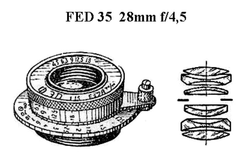 Released in mid-30's, the FED 28mm f4,5 closely matched the outer forms of a Leitz Elmar 35mm f/3,5, but it's deluxe optical formula was really advanced against the famous German competitors, Leitz Hektor and Zeiss Jena Tessar. What turns this lens a really admirable Soviet realization is the fact they have minimal total dimensions of the optical parts. The frontal disc of the lens has a diameter of approximately 7mm (analogous dimensions also have the other elements), while the thickness of the third, the most thin of the group, does not exceed the 6-7 tenths of millimeter. Imagine the difficulties met in the grinding and the assembly of each of these elements, maintaining a reasonable precision. The photos illustrating this rare objective have been realized purposely by Dr. Milos Paul Mladek, beloved friend who kindly offered to divulgation and we give our thanks of heart for the contribution. Mario Cavina In the last photo we see a FED B in a complete vintage outfit with normal f2 50mm; f3,5 50mm macro; f5.6 100mm; f6.3 100mm; and f4,5 28mm; wide angle sport finder, telephoto finder, angular finder, self timer and lens caps.