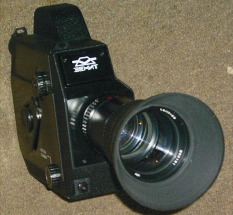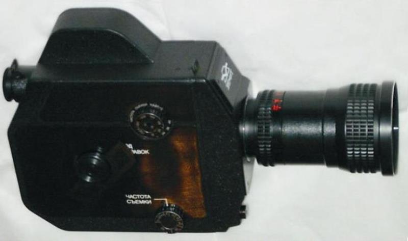 New angled mere attractive body. General specifications equal to Krasnogorsk3: Lens: Meteor 5-1 f1.9/17-69mm. Zoom range 17-69mm, Speeds: 8-48 fps, M42x1 screw mount, semiautomatic aperture setting, M77x0.75mm filter thread. Viewfinderdiopter correction (+5...-4). COMPLETE SET INCLUDES: camera body; 17-69mm zoom lens METEOR-5-1; Lens cap; Sun shade; Zoom lever; Leather case; Lens hood; Leather carrying strap; Screw-in hand strap; Pistol grip; Eye cup; Flexible cable release; Rubber eye piece; Viewfinder cover; 5 filters and 3 film spools.