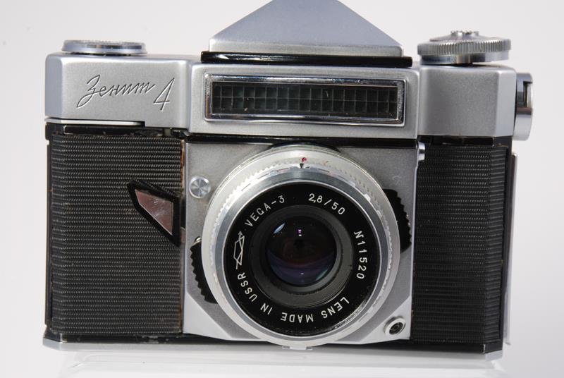 The Zenit-4 ,Zenit-5 and Zenit-6 are all variations of a totally new design, having little or nothing in common with previous designs. The Zenit-4 is a leaf shutter Single Lens Reflex with a built in light meter and interchangeable prism. The Zenit-4 can be operated manually or in a semiautomatic manner. The Speeds and f stops are mechanically interlocked so that changing one automatically changes the other. The camera is covered with black nylon fabric. All controls on the front of the camera are on the lens mount. Lens mount is the same as the Voigtlander Bessamatic and all lenses are interchangeable. Engraved on the upper right of the camera is "ZENIT-4" in Cyrillic script or English block letters. Centered over the lens is the selenium photocell (source: http://www.commiecameras.com).