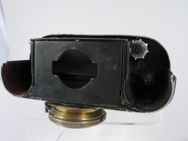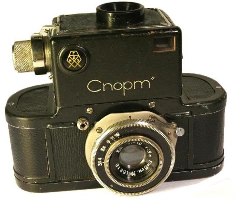 Mass produced model of the GELVETA. The back of the camera is like the CONTAX. The system of changing film was by 35mm automatic film cassette designed especially for the SPORT. A fully loaded film cassette gave 50 exposures 24x36. The front of the viewfinder was engraved with the GOMZ sign and the glass finder was coloured yellow/orange. The viewfinder strap pins replaced by a decorative rectangular ring surrounding the eye-piece. The top-plate held first by 6 screws and then by 2. In spite of the bayonet, no other focals other than the f3.5/50mm.