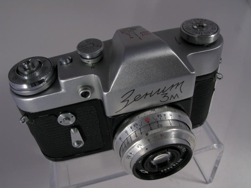 A commemorative Zenit 3M of 1917-1967 - 50 years since October revolution, depicting Kremlin, Cruiser Aurora and a space rocket. Also with KMZ-logo in front.