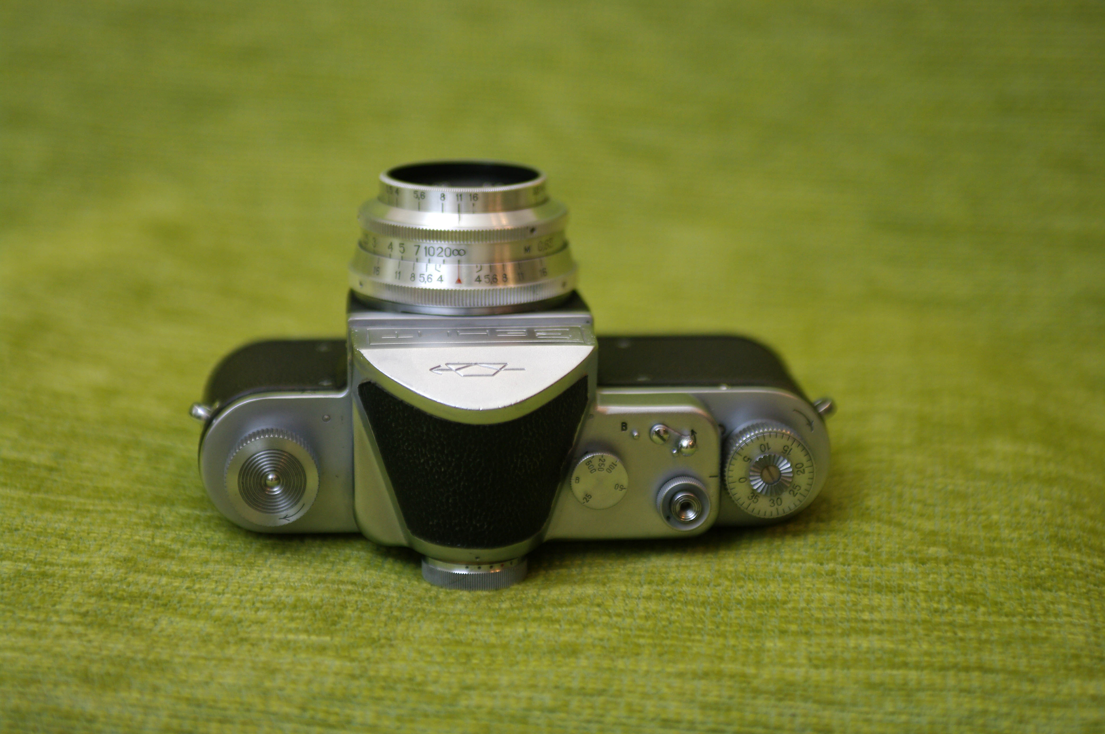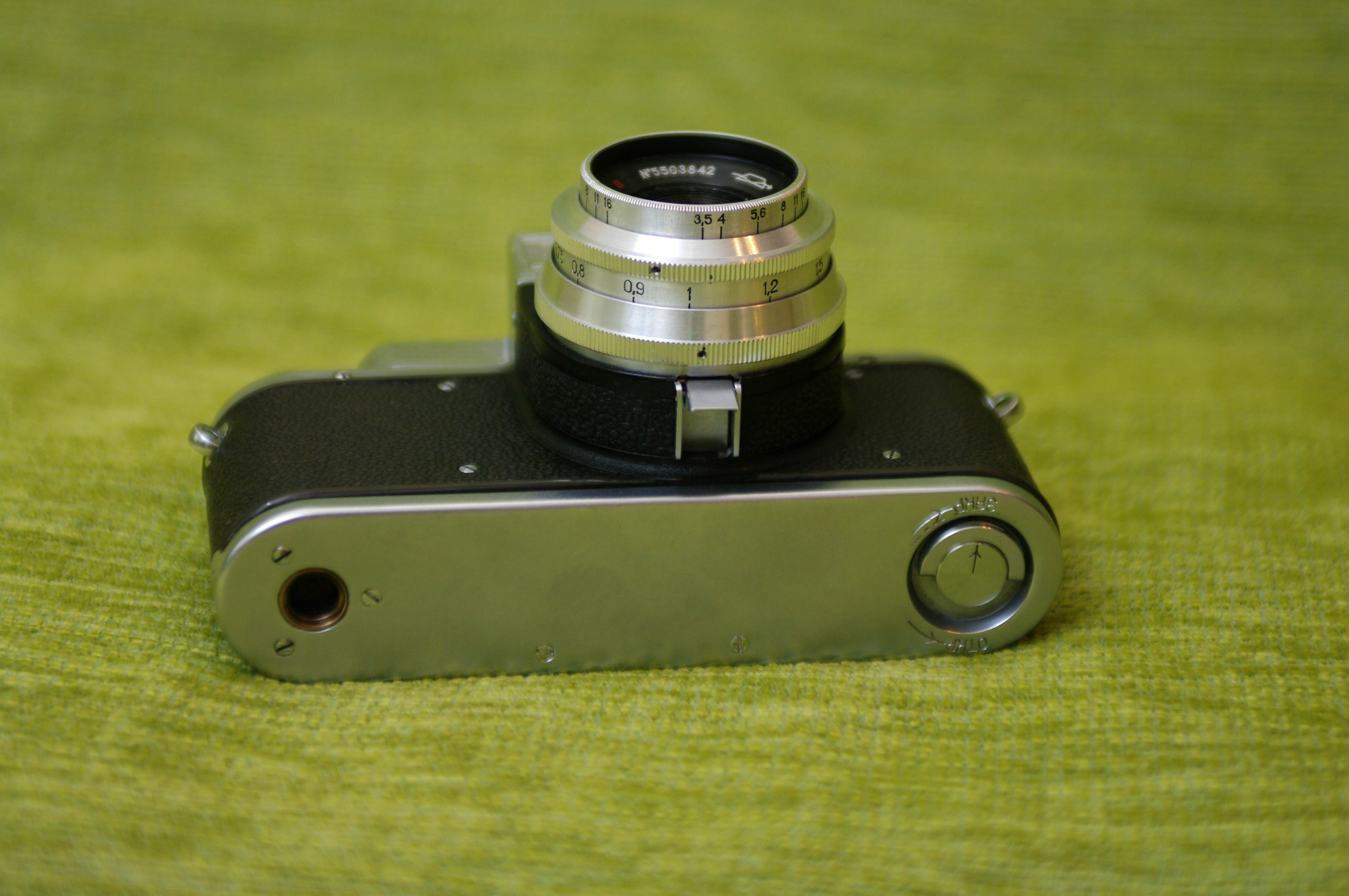 Объектив, конечно, не родной, 55 года. Но о годах производства самой камеры я бы сказал так: камера производства 1950 -1952гг.(кажется тогда появились первые серийные экземпляры) Мне кажется, что логотип ЗЕНИТ впервые появился на моей камере, если считать это предсерийным образцом . Скорее всего камера создавалась для обкатки технологии изготовления и визуализации её в собранном виде. Ещё , если внимательно присмотреться, то можно увидеть, как некоторые технические решения перенесены с моей камеры на камеру ЗЕНИТ L/ 1. НА этих камерах идентичны цифры шрифта номеров.(фото в приложении 2. Логотип завода на обоих фотоаппаратах сделан на хроме. 3. Есть общая деталь на нижней крышке обеих камер: если Вы посмотрите фото Зенита L вид снизу-то можно увидеть два винта. (фото в приложении). У моей камеры есть точно такие же винты.На них крепится планка(возможно для лучшей фиксации плёнки.),которую можно увидеть на фото номер 04. 4. На обеих камерах есть корректор диоптрий.(на Зенит L он менее технологичный, т.к. наверное в шахте не хватило места.)