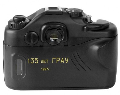 Very uncommon commemorative version of the particular camera. Dedicated to 135th anniversary of "ГРАУ" (Главное ракетно-артиллерийское управление Министерства обороны России). Unfortunately it's not easy for me to translate this abbreviation in to english, but this is famous high-rank russian military structure, founded in 1862. Camera opposite from Ilya Stolyar (USA) coll.