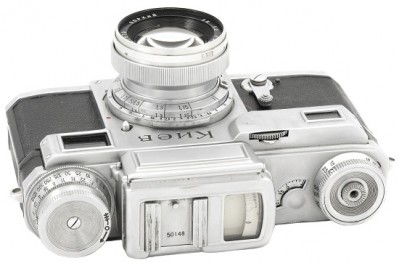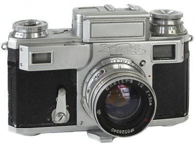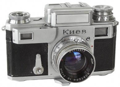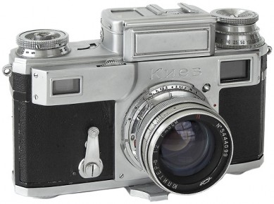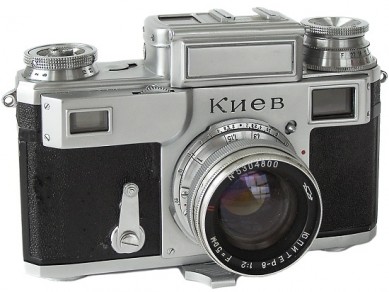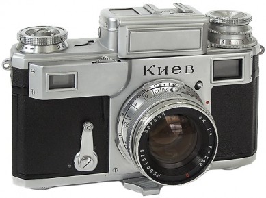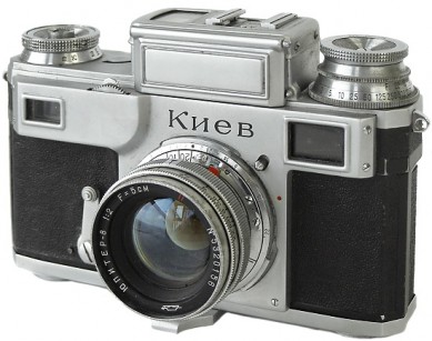 | | | Produced: 1948-1958 Name: „„Киев“ Producer: Arsenal Frame size: 24x36. Lens: Jupiter-8 2/50. Shutter: 1/2s, 1/5s, 1/10s, 1/25s, 1/50s, 1/125s, 1/250s, 1/500s, 1/1250s + B. Quantity: ±120.000 units [1]. Camera opposite from Ilya Stolyar (USA) collection. |