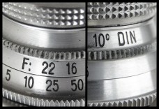 | | | Kiev-3 #A525578. | | | | Although this common Kiev III is announced to be assembled from domestic parts completely, DIN settings prove us it's not so for sure. That mean, that 1954 issued cameras still used spare Contax parts indeed.