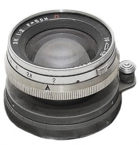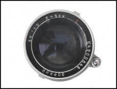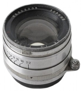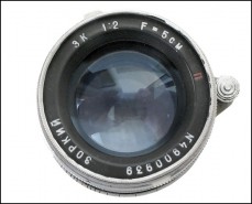 PT3005. Carl Zeiss Jena Sonnar 2/50mm lens, from the original parts assembled in the Soviet Union. Under initial name "ZK 2/50 mm" ("Sonnar Kransogorsk"). Very limited batch of these collapsible lenses released by KMZ in 1948. Focal length - 5 cm, aperture range f2 - f22. Focusing range from 1 m to infinity. Number of elements/groups: 6/3.  Angular field - 45º. Zorki (M39) mount. An earliest so far known lens has s/n #001109 1948 (Leica Copies by HPR).
