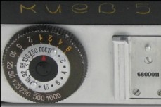 PA1005. Kiev-5 prototype with parallax correction, released in 1965. Only few samples are known to exist. Huge "Kiev-5" markings on the top plate (see picture below). Original design of the selftimer lever. Synchro contact located in the left side of the frontplate, under the finder's window. Big shutter speeds (advance) head. At least one real camera is known to exist in private collections.