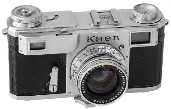 The Kiev 4 in metered and non metered ( 4A) models--was made from the 1950s until the 1980s. The last variant, the Kiev 4AM, had such modern refinements as a hot shoe and real rewind crank. The construction quality of the 4AM wasn't as good as the earlier cameras, however. I read somewhere that toward the end of Kiev production in the early 1980s, the quality was so poor many of the cameras were hauled directly from the factory to the dump!