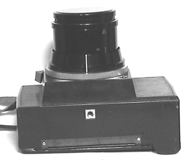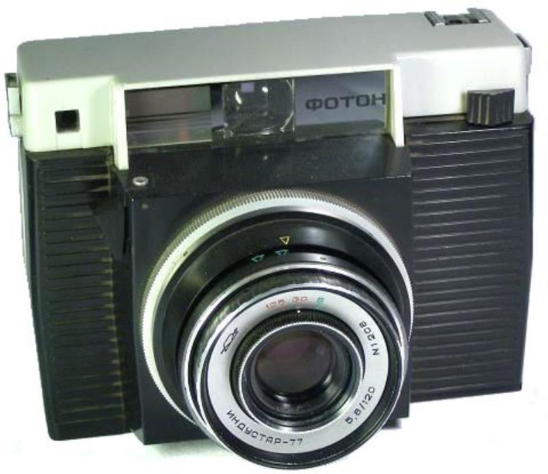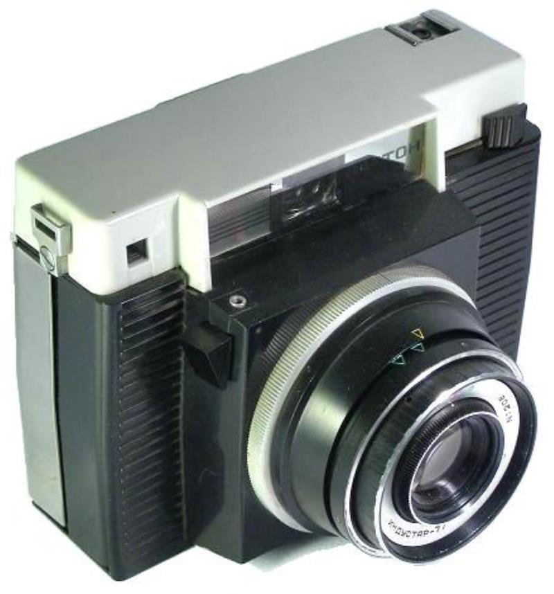 This is perhaps the most interesting instant camera ever made. It uses the same film as the Moment. This is a giant range finder camera. It has a non removable collapsible Industar-77 lens assembly with a leaf shutter and speeds of 125, 30 and B. The shutter is cocked by rotating the front portion of the lens. The Shutter release is a large black button on the side of the camera. There is a cable release socket on the camera body above the shutter release. The apertures are set by moving a square sliding button to the left of the viewfinder. The camera has both a hot shoe and a flash jack. It was unsuccessful for the same reasons as the Moment. (source: http://www.commiecameras.com).