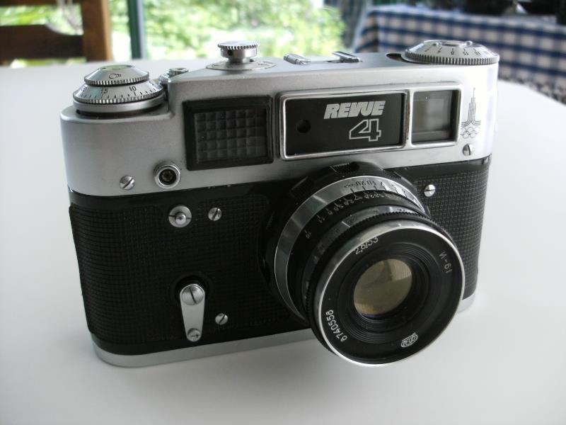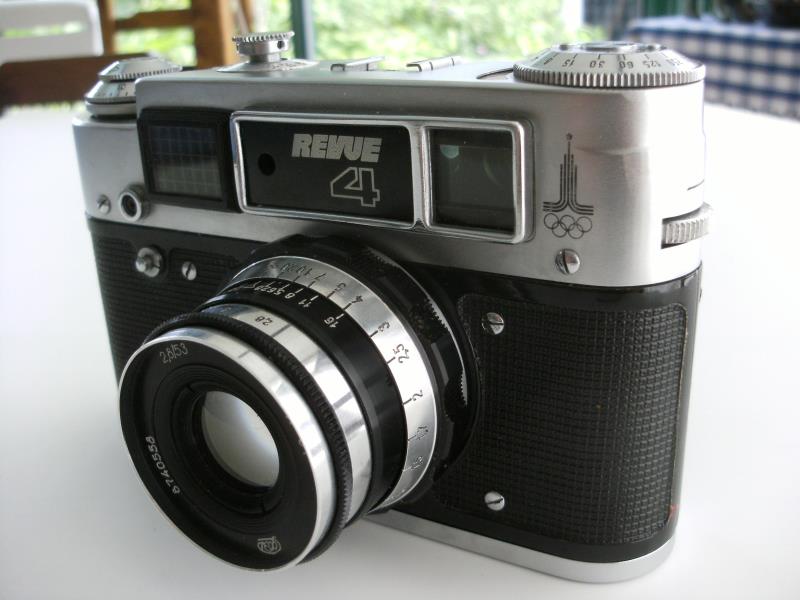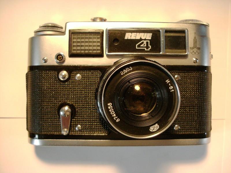 Second version of Revue 4 which was made from the FED 4b for Foto-Quelle, West-Germany. On this version "Revue 4" is serigraphied in white (engraved on the first version). Same other characteristics as the FED 4L in the Wiki.