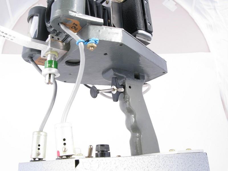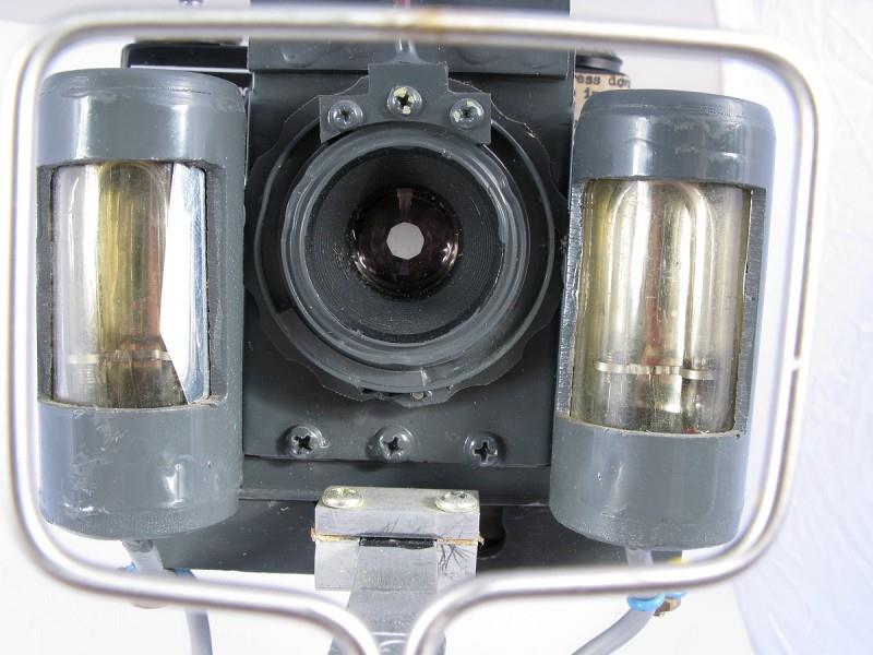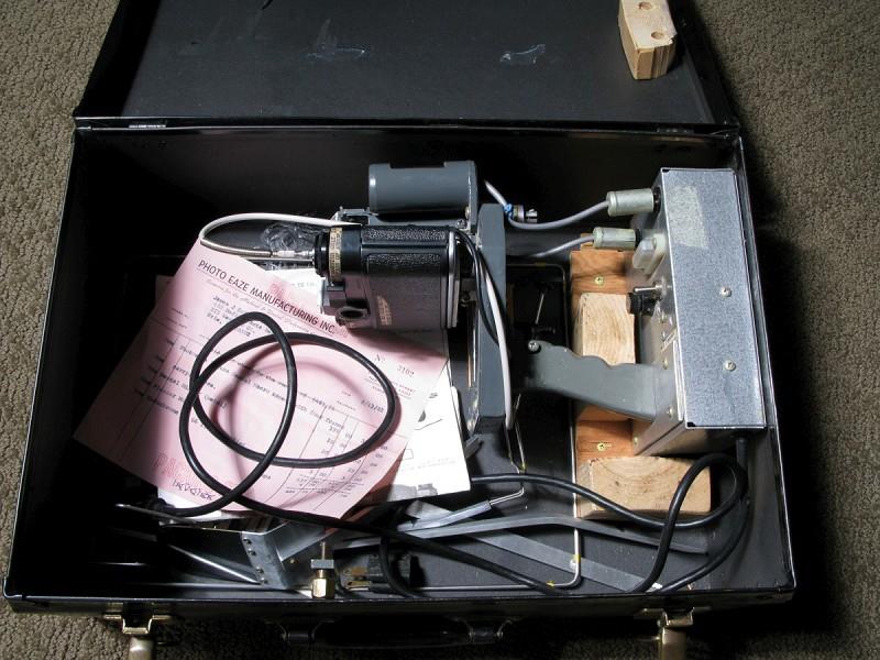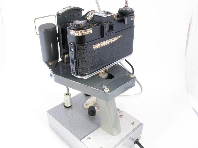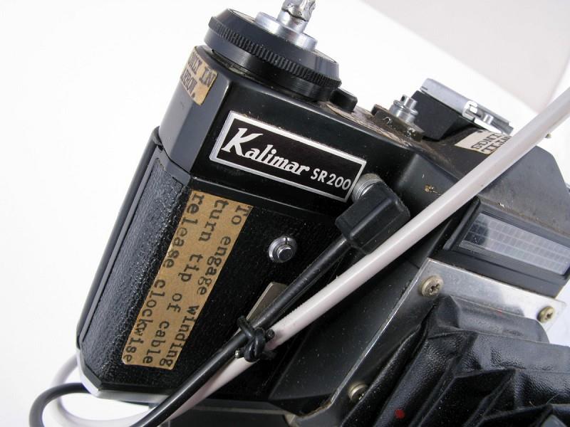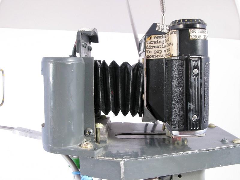 The camera has macro bellows attached to it with specialized lens. The speed shutter dial is taken off so it is hard set on 1/30. The camera is fired by a trigger on the bottom of the system - a la pistol grip, with cable release going up to the camera.