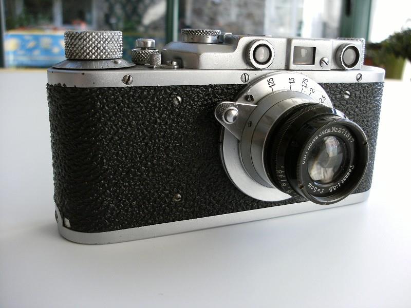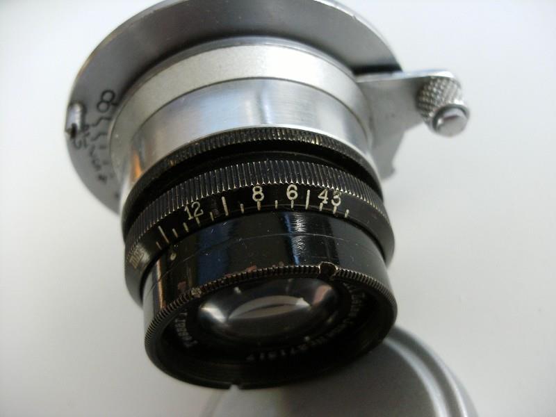 When received, it was equipped with a strange 3,5 Tessar, mounted on a Fed rear part (old depth of field scale, so pre WW2) and a wedge on which the black part is screwed. Serial number 271317 for this Tessar, so it could be very old. No explanation about this lens which gives a strange and cyclopean look to this camera!