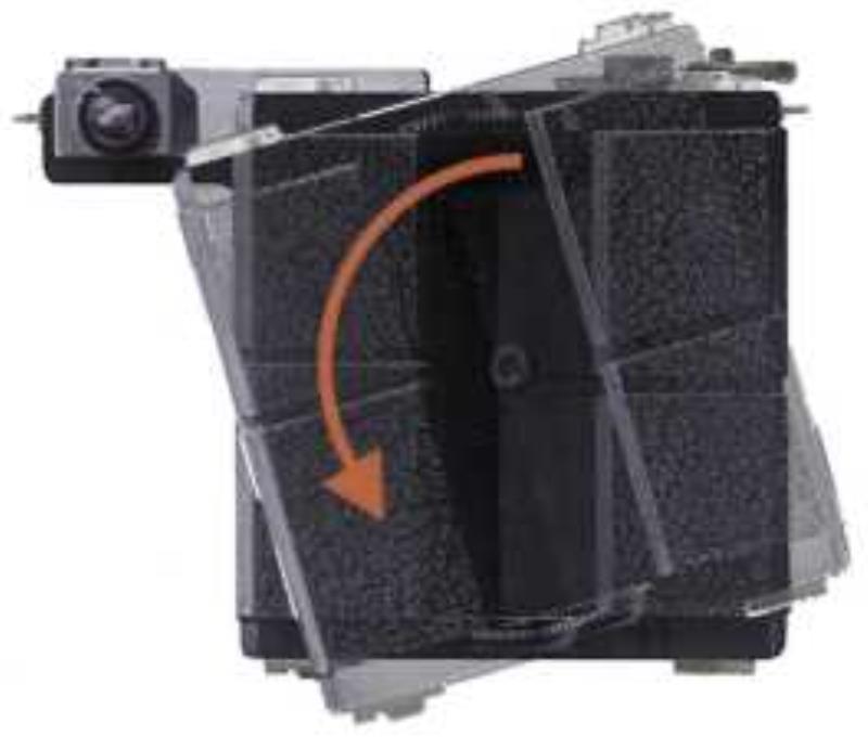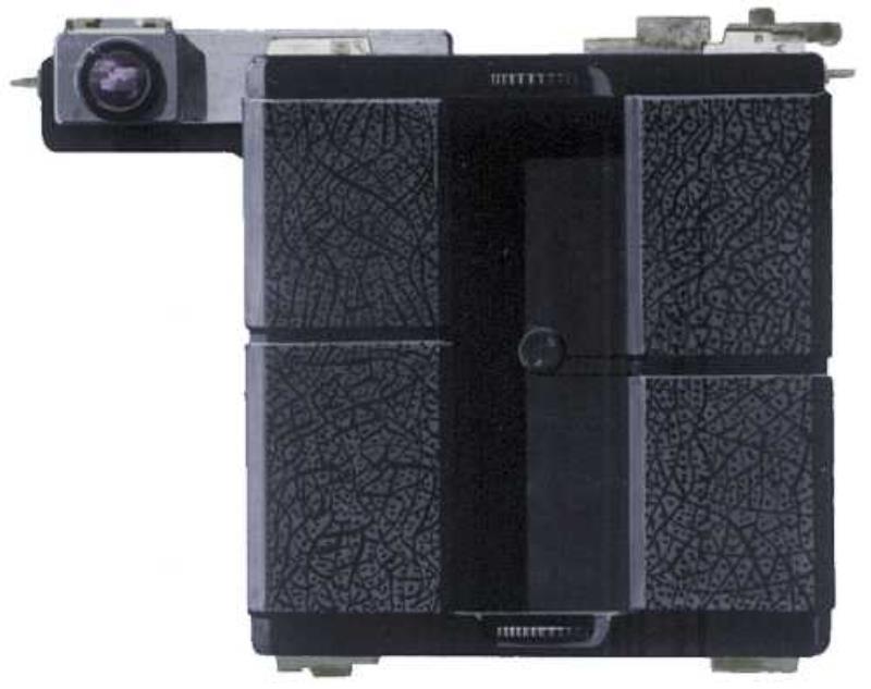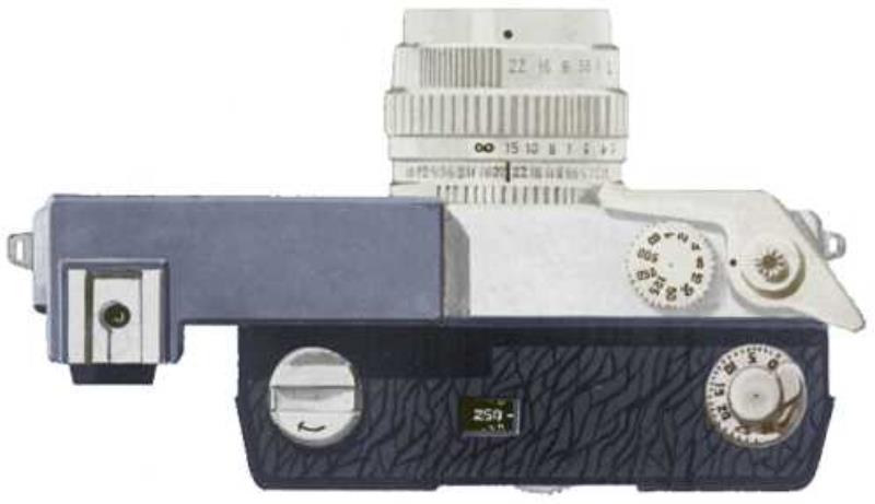 Each film compartment part had its own mechanisms of film rewind, film counter and an ISO setting knobs. Because of the rotating back part, the rangefinder had to be exended dramatically from the body.