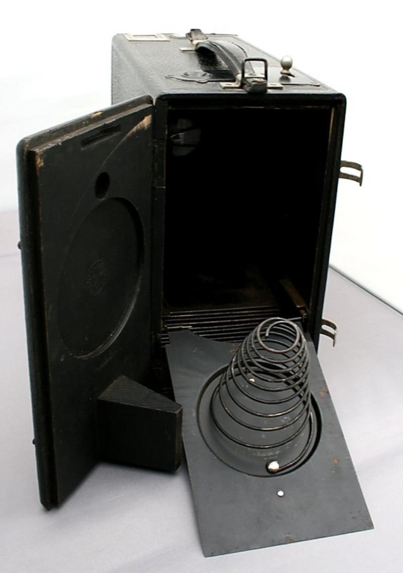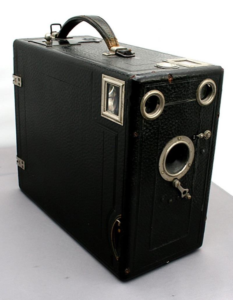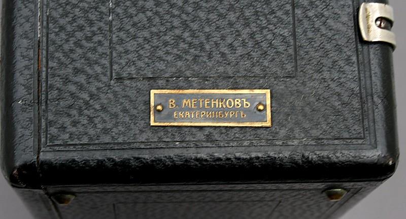 This drop-plate 9 x 12 cm box camera was manufactured by ICA AG. of Dresden, Germany around 1910. The small plaque on the back of the camera shows that it was imported for sale in Russia by V. Metenkov of Ekaterinburg. As Ekaterinburg had its named changed to Sverdlovsk in 1924, it was almost certainly imported before that date.