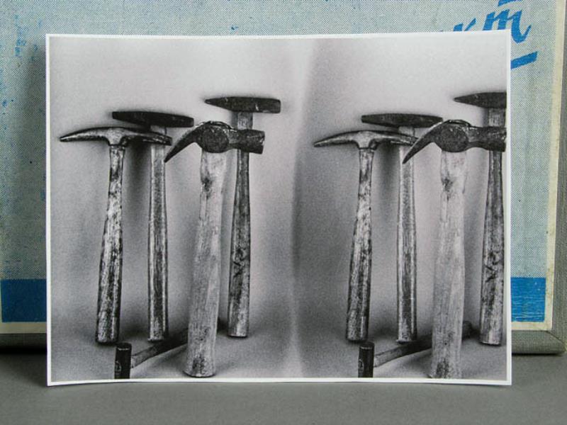 Notes: The stereoview photograph of hammers was taken with this unit, showing that the prisms in the beam-splitter need a slight adjustment or alignment, but a good stereo effect is achieved with the unit and maybe it would work on a FED too !