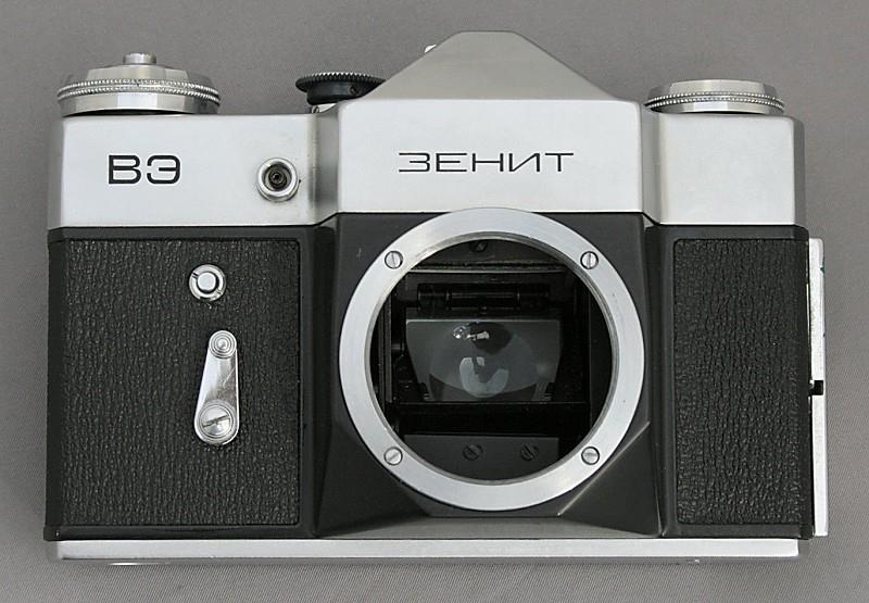 The Zenit VE, which is based on the Zenit V (B) camera body, but has a special viewing screen with a clear circular centre field. This is thought to be for use with endoscopes and microscopes. It has a standard fabric, focal plane shutter with speeds from 1/30 to 1/500 second plus B. It has a 42 mm screw lens mount, a self-timer and is synchronised for flash.