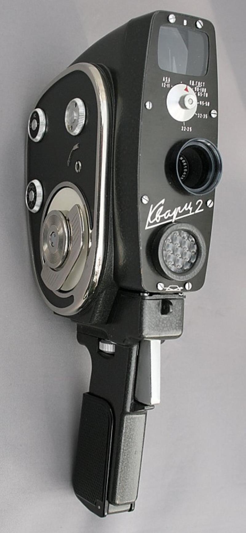 The Quarz 2 is an upgraded version of the Quarz, having a built-in selenium exposure meter. The meter can be set for film speeds from 12 to 90 ASA (11 to 100 GOST). The meter needle and index point can be seen in the viewfinder. The fixed lens is Jupiter-24 f 1:1.9 12.5 mm. Filming speeds are 8, 16 and 32 frames per second. The aperture selection lever is moved to the opposite side of the camera from that of the Quarz.