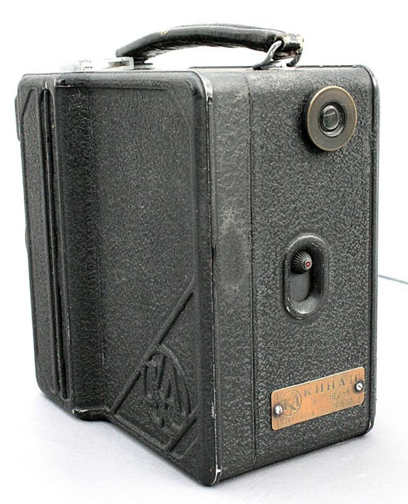 The Kinap 16S-1 is a 16 mm movie camera from the late 1940s , early 1950s. This one is dated 1950. The identification plate shows that it was made by Kinap in Leningrad. It is powered by a clockwork motor and has filming speeds of 8, 16, 24 and 48 frames per second, in addition to single frame. The lens is interchangeable and is released by the two catches under the lens. The standard lens is the Lenkinap 1RO51-1 f 1:2.8 2cms. The viewfinder has frames marked for 2, 3.5 and 5 cm lenses, a central spot coupled rangefinder and is parallax corrected. The film cartridges, of which three are supplied in the fitted camera case, each hold 15 metres of film.