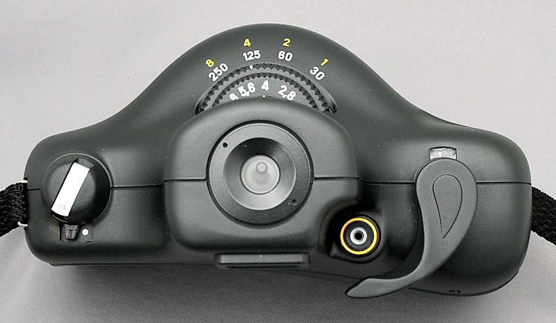 The Horizon S3 Pro (Initially designated Horizon 203) is the first of a series of S3 panoramic cameras. The S3 Pro camera follows on from the Horizon 202 and has a more rounded body design and a quieter, smoother lens-swing. The S3 Pro has a dual-speed lens swing which is switched by the lever below the film-rewind crank. On the slow swing, shutter speeds are 1/8 to 1 second, and on the fast swing, 1/30 to 1/250 second. Two concentric disks, one below the other, under the viewfinder, set the aperture and shutter speed respectively. The lens is the MC 2.8.28 MG. There is a spirit level on the top of the camera that can be seen in the lower part of the viewfinder when composing the picture. The complete kit consists of the camera, a nylon case, a hand grip and three filters.