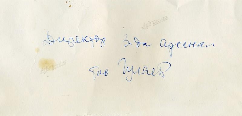 Caption on the back, handwritten in pen, reads: "Director of factory Arsenal comrade Gulyayev."