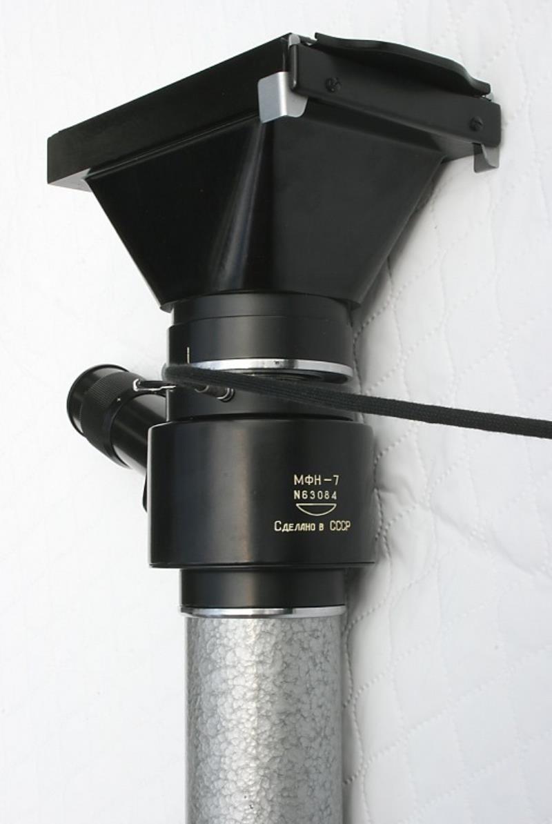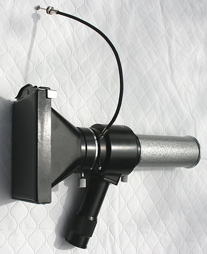 The MFN-7 is a microscope camera using 6.5 x 9 cm plates. It was manufactured in the 1960s. It has a shutter with two settings marked K and M. M is 1/30 second and K is B. A locking cable release is provided so that the K setting can be used as T. The outfit consists of a tube to attach to the microscope, two eyepieces, x 7 and x 10 (which fit in the tube), the basic camera with viewing tube, three plate holders, a cable release and a selection of filters.