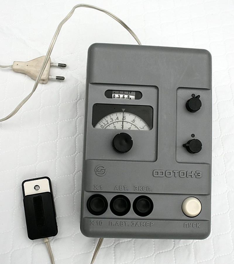 The Foton-3 is an enlarger timer and print exposure meter. It can be used as a stand-alone timer, but is more useful when the probe is employed to measure negative densities on the enlarger easel. It can then automatically set the exposure time to suit the negative and degree of enlargement. Manufactured in Sverdlovsk by the Izgotovitel Factory in the 1970s.