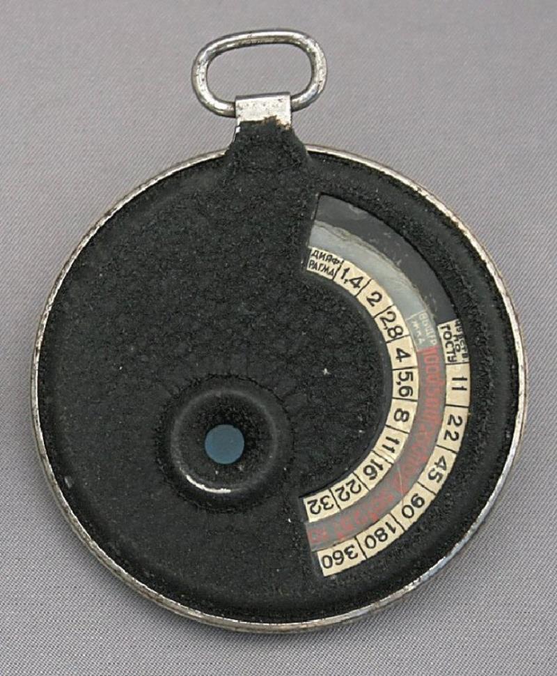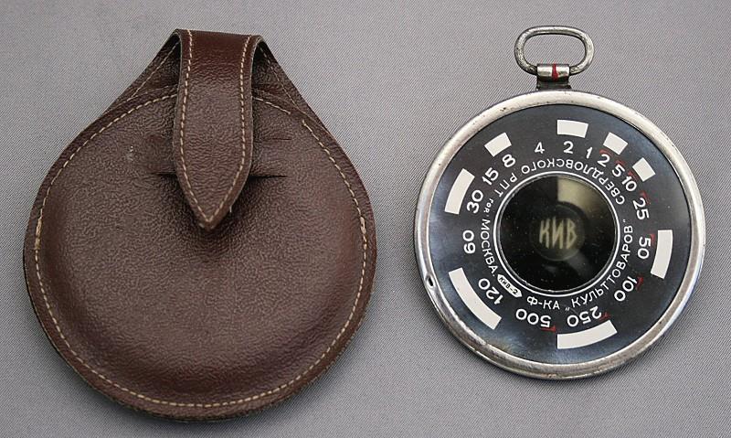 The KIV-2 is an extinction-type exposure meter. It was manufactured by Kulttovarov of Moscow, probably in the 1950s. On the front of the meter, behind glass, there is a scale of exposure times from 1/500 to 120 seconds. On the back are three scales and a small viewing aperture. The outermost scale is the film speed index marked from 11 to 360 GOST. The innermost scale is the aperture setting which ranges from f/1.4 to f/32. Between these two is a scale of exposure times from 1/1000 to 4 minutes. The small viewing aperture has a graduated neutral density filter behind it, so that by rotating the outer ring, the density can be adjusted to match the subject matter, thus allowing the exposure to be calculated.