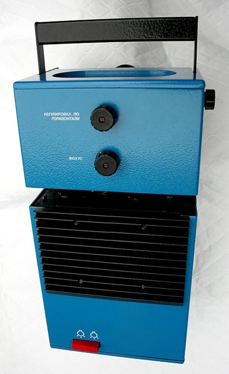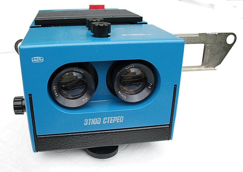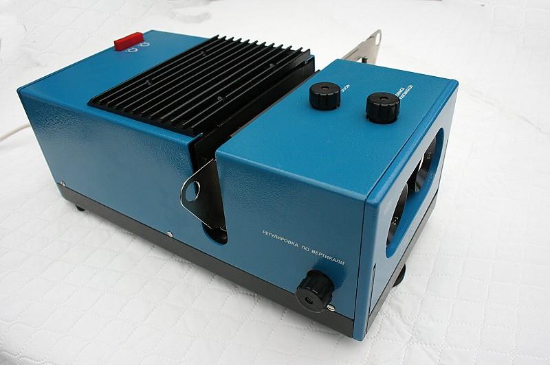 The Etude Stereo projector was manufactured by FED especially for the FED-Stereo camera. It has twin T-3 f/2.8 80 mm lenses and twin KGM 220-230-200 lamps. Equivalent lamps are the A1/248 240 V, 150 W type. The projector has a built-in carrying handle, which unfolds from below the lenses (picture 3).