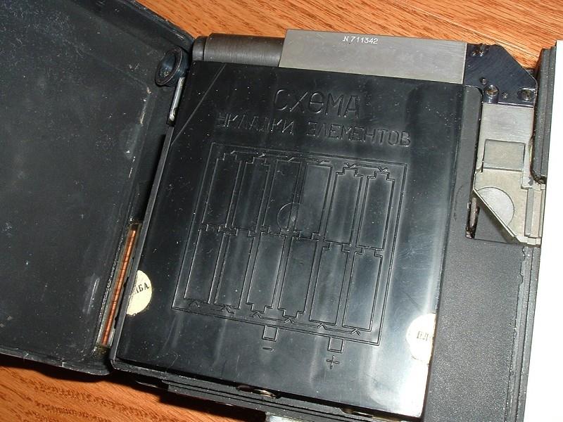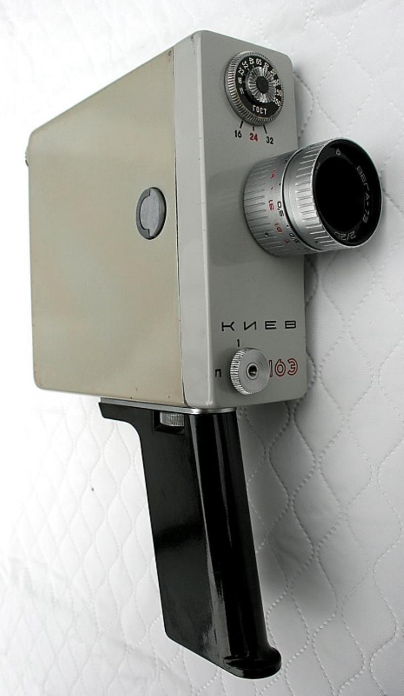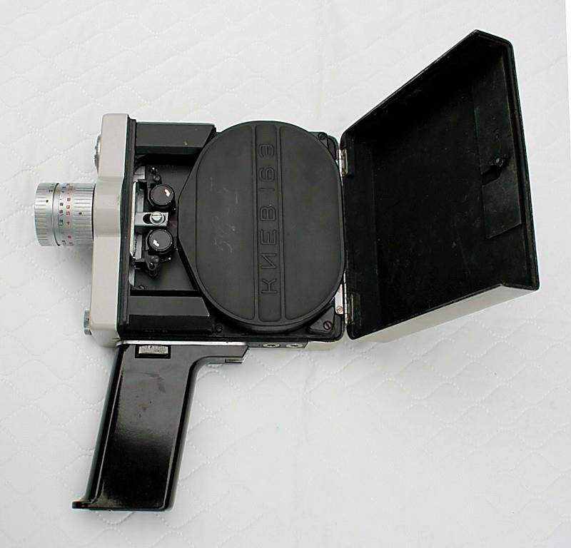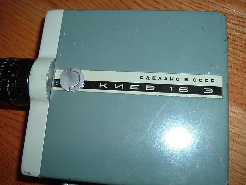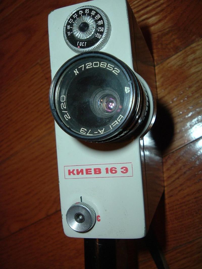 The Kiev 16 E is a 16 mm movie camera with electric motor drive(E stands for ELECTRIC). It has three filming speeds of 16, 24 and 32 frames per second, plus single frame. The removable 'C' mount lens is a Vega-7E(or may be Vega-73?) f/2.0 20 mm. TTL metering via a CdS cell can be set from 11 to 350 GOST.