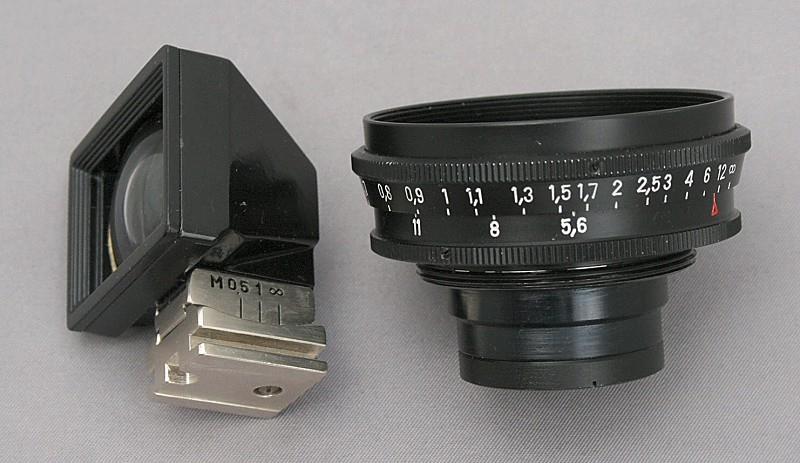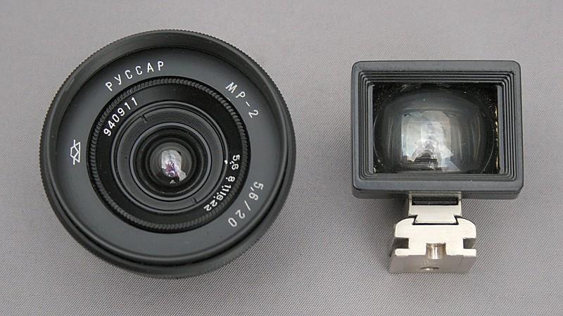 The Russar MR-2 was manufactured by KMZ for the Zorki / FED. It has a maximum aperture of f/5.6 and a focal length of 20 mm. It will focus down to 50 cms. This particular one has a black finish. In the photos, you will see alongside the lens, the specially produced viewfinder. The base of which is made to slide, so tilting the viewfinder in order to correct for parallax.