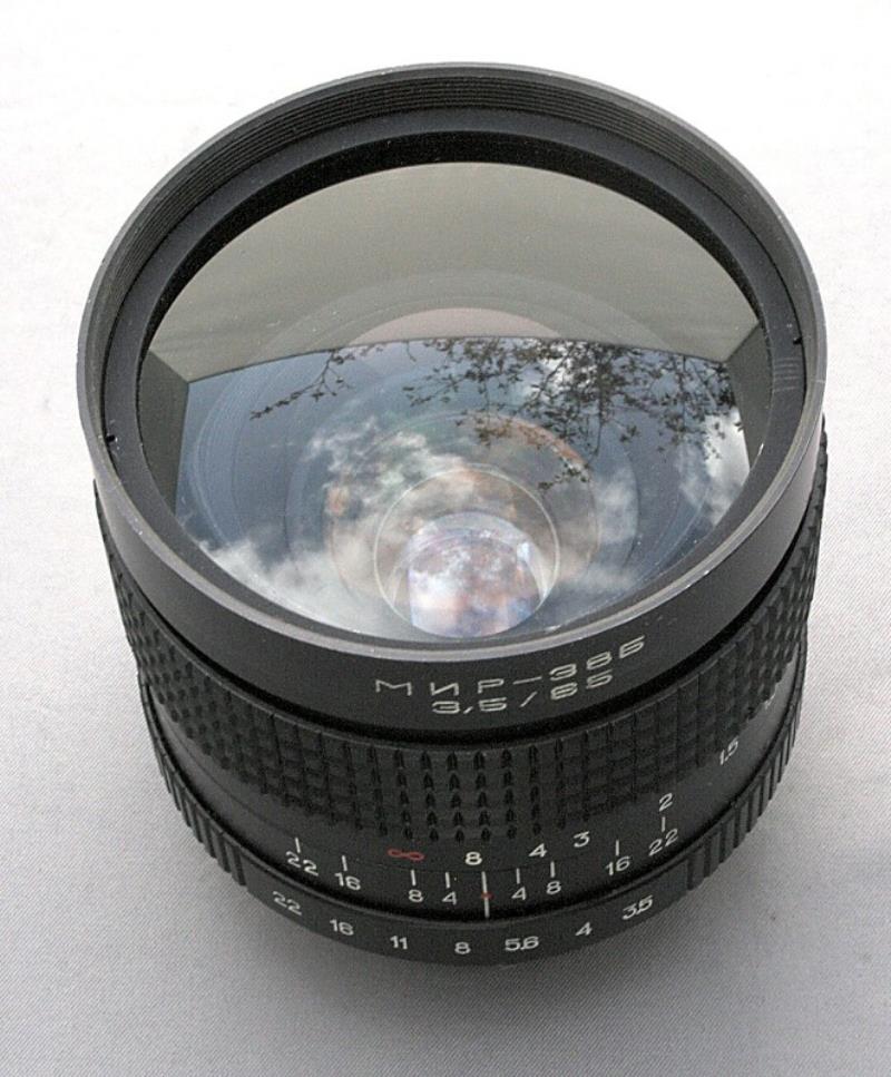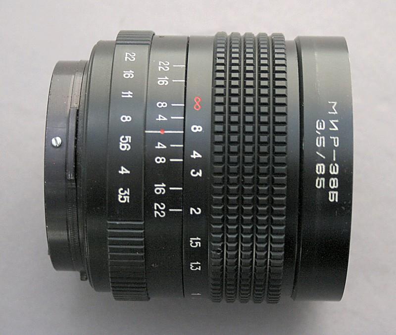 The Mir-38B is a lens for the Kiev-6S/60. It was also available as the Mir-38V for the Kiev-88. It has a maximum aperture of f/3.5 and a focal length of 65 mm. It focuses down to 0.5 metres. It was manufactured at the Arsenal works was supplied in a fitted case containing the lens, lens caps and filters.