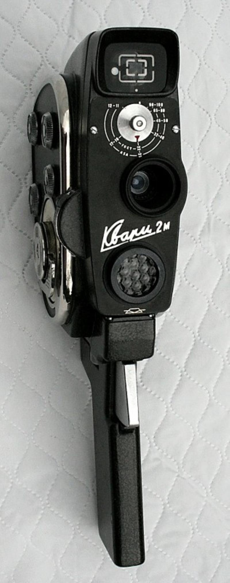 The Quarz-2M is a clockwork driven movie camera with filming speeds of 8, 12, 16, 24, 32 and 48 frames per second, plus single frame. The lens is a Jupiter-24M, f1.9 12.5 mm. The camera has a built-in selenium meter with a film speed range of 11-90 GOST (12-100 ASA). It also comes with two supplementary lenses (Photo 4) of 0.5X and 2X. The complete kit also includes a pistol-grip, wrist-strap and a selection of filters for both the standard and supplementary lenses, all in a fitted outfit case.