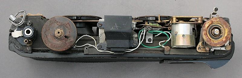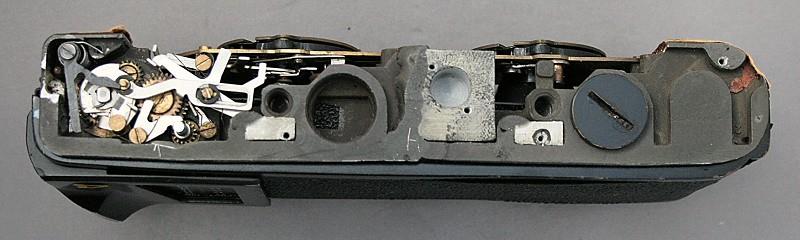 This is an incomplete FED Stereo prototype. It appears to be made from two FED Micron-2 cameras welded together. I am assuming the the number 4 on the back and also scratched on the bottom indicate that this is version number 4 of the development process. The fact that it is incomplete probably suggests that the missing parts were swapped onto other versions.