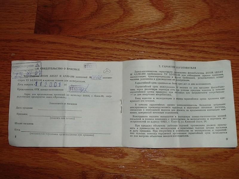 But then in upper left corner of the "Quality control” page in the manuals you can see interesting artifact, stamp saying "Rechecked on 23-rd of November 2004" Manuals also said that warranty period for storage is 3 years. Probably Arsenal could not sell this lens for more then 3 years and has to open it and recheck to be able to keep lens on the shelf. Remember that serial number on the lens is only 8428, minuscule by previous standards. This show straggle of the company to compete on the World photo market after dismantles of Soviet Union.