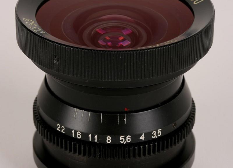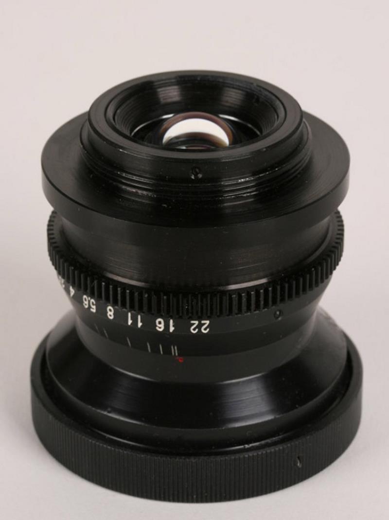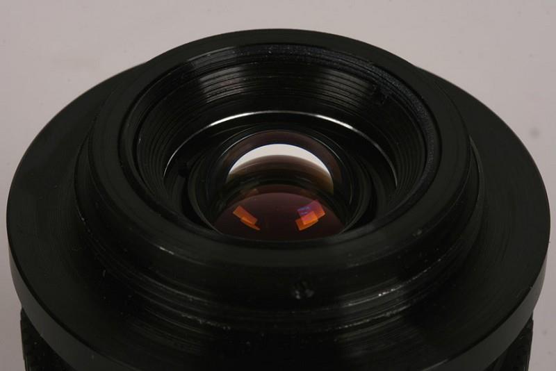 This lens is an improved version of the "Hydro Russar" lens, for underwater use. There is no focusing ring as depth of field is so great. The front of the lens is covered with a blue-coated protective disk of glass, mounted as to be water-tight. Front and back elements are coated with a purple coating.