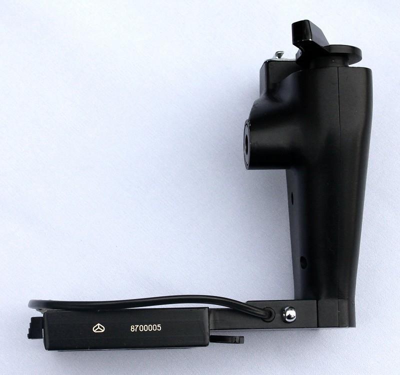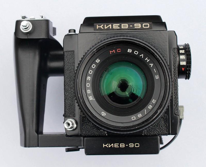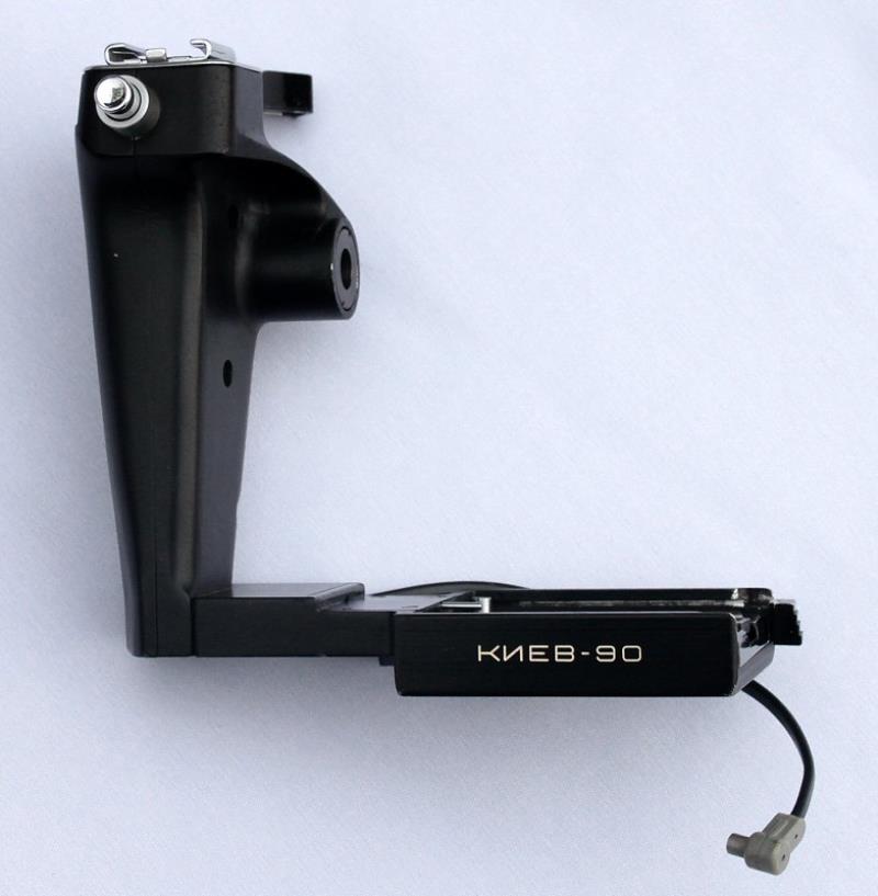 The Kiev-90 grip is fitted to the camera after first removing the film wind crank knob. The grip then slides onto the plate on the base of the camera and is locked into position with a lever on the bottom of the grip. There is a hot-shoe on the top of the grip which is connected via a lead to the flash socket on the camera. On the top of the grip is a lever-wind that advances the film and cocks the shutter. The shutter relaese button is also at the top of the grip.