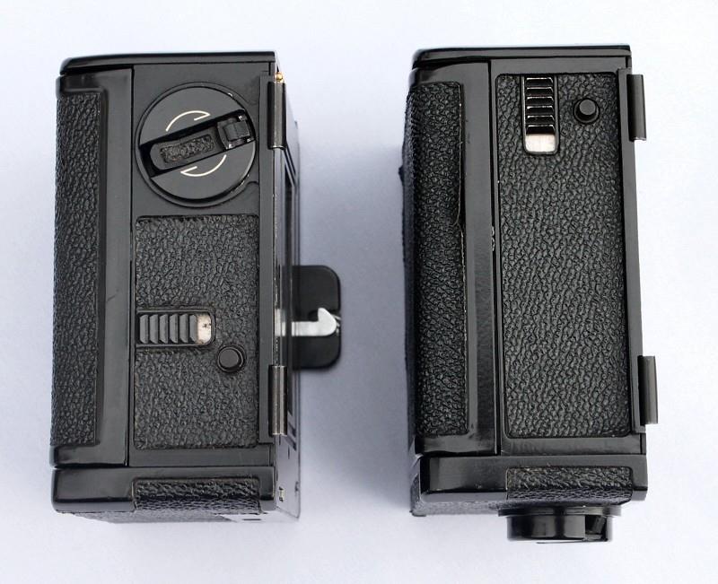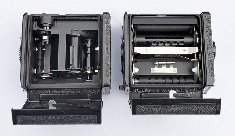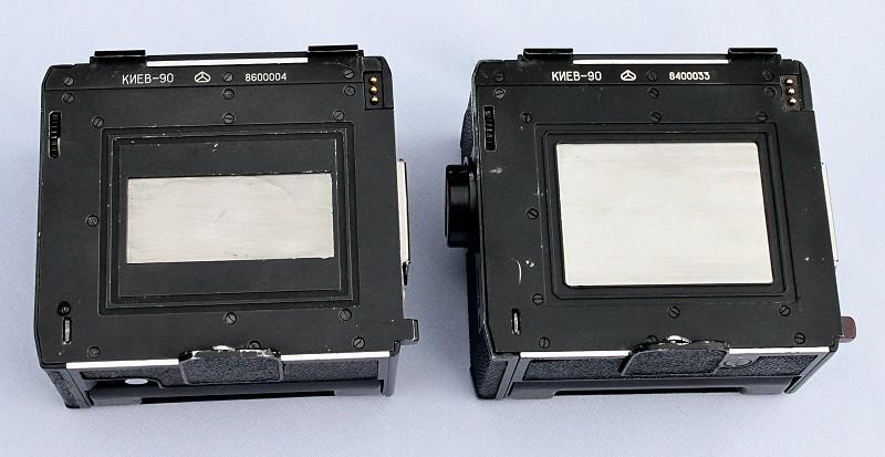 The photos show the differences between the standard 6 x 4.5 film magazine and the 35mm film magazine for the Kiev-90. Although from the front, the 35mm magazine appears to have a panoramic format, it is in fact standard 24 x 36 mm. In each case, the 35mm magazine is on the left.