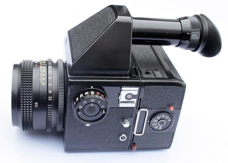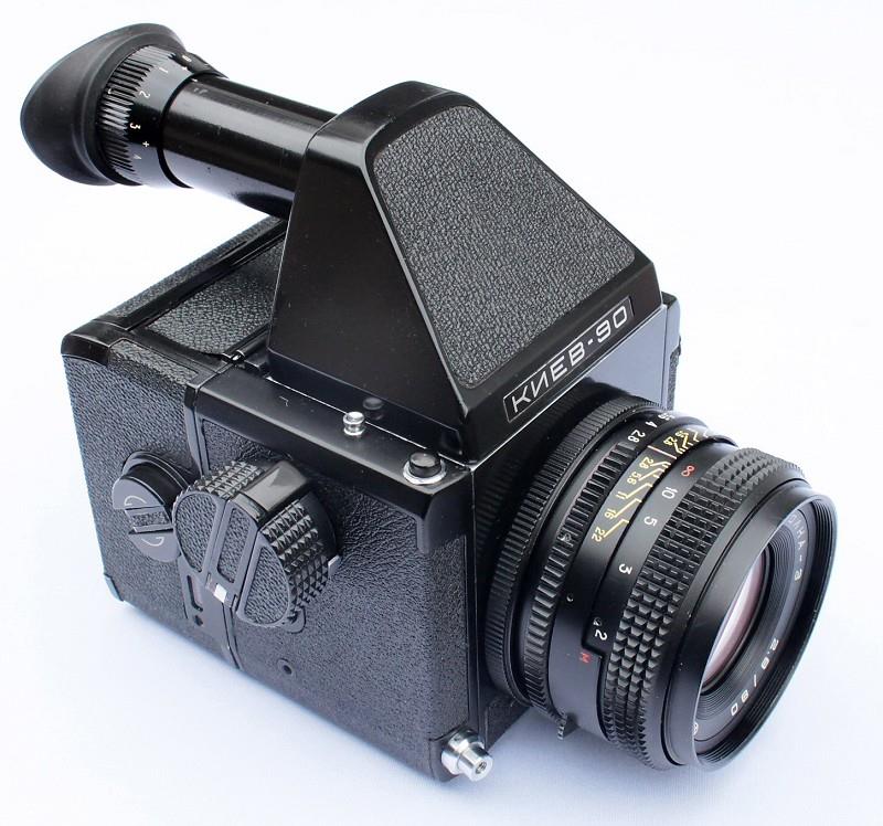 The Type 1 Kiev-90 was manufactured by the Arsenal factory between 1983 and 1985. It is a 6 x 4.5 cm single lens reflex with interchangeable film magazines, focusing hoods and lenses. It has manual and automatic functions. The shutter fires at 1/30 in mechanical mode, and has a range of 4 seconds to 1/1000 plus B in electronic mode. LEDs at the side of the viewfinder screen indicate the shutter speed selected. The standard lens is f/2.8 80mm Volna-3.