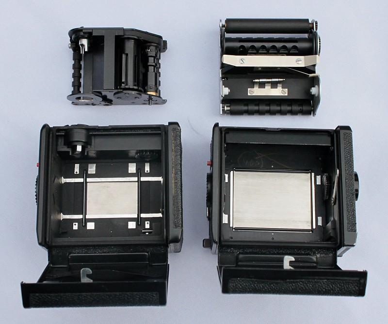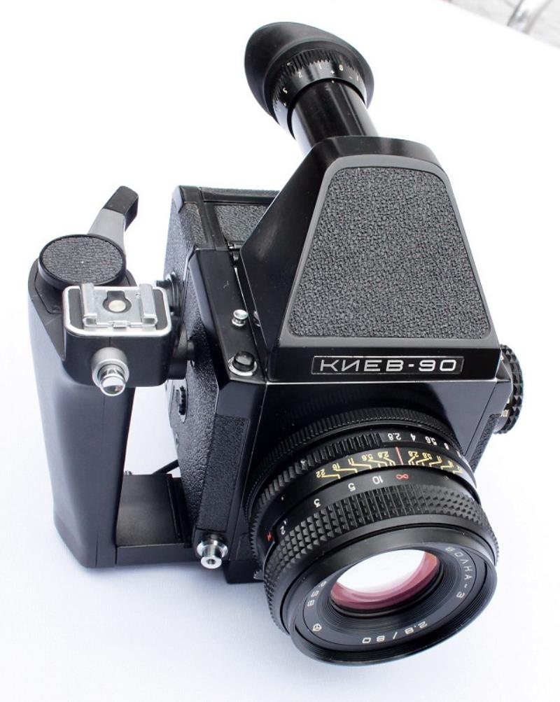 The 3rd and 4th pictures show the Kiev-90 with its grip attached. The final set of pictures show the 35mm (24 x 36 mm) compared to the standard film magazine.
