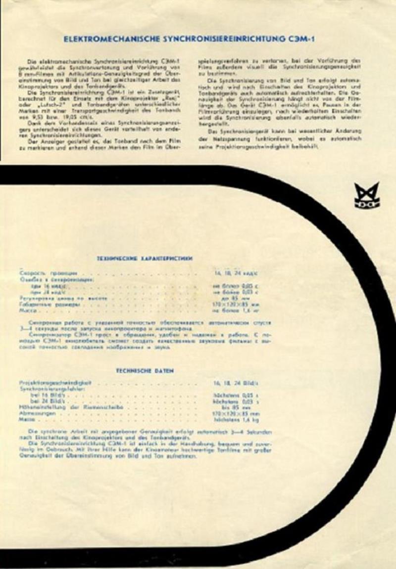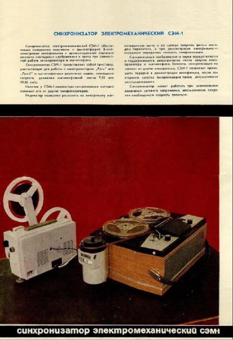SEM 1 synchronizer Very similar to SEL-1 Synchronizer. produced by another factory synchronizes image of Luch 2 and Russ projector when operated at 16, 18 or 24 fps in 9.53 cm/s and 19,05 cm/s tape recorder speeds.