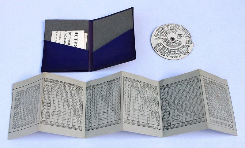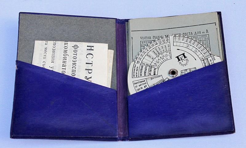 This consists of a small wallet containing an exposure calculating disk, instuction leaflet and light tables.