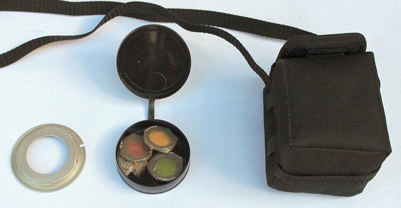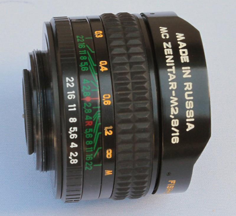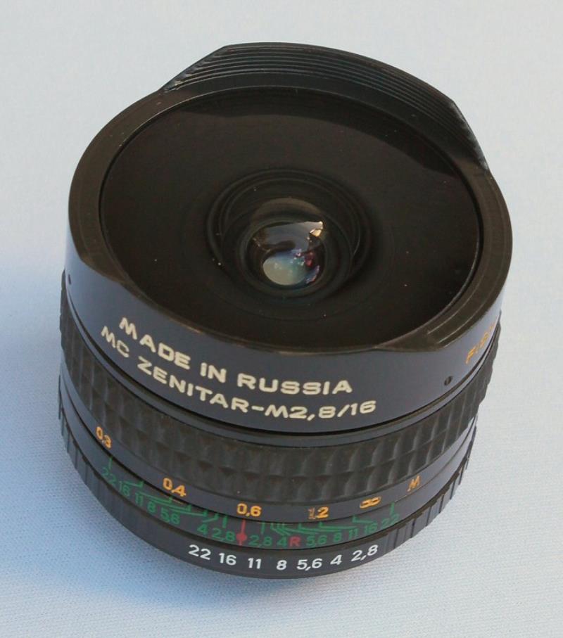 The MC Zenitar-M is a fish-eye lens manufactured by KMZ. It has a maximum aperture of f/2.8 and a focal length of 16 mm. It has click-stops down to f/22. It consists of 11 elements in 7 groups. The mount is M42 screw. The lens is supplied in a soft fabric case, complete with three filters that mount on the rear of the lens.
