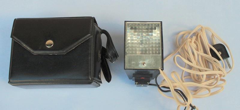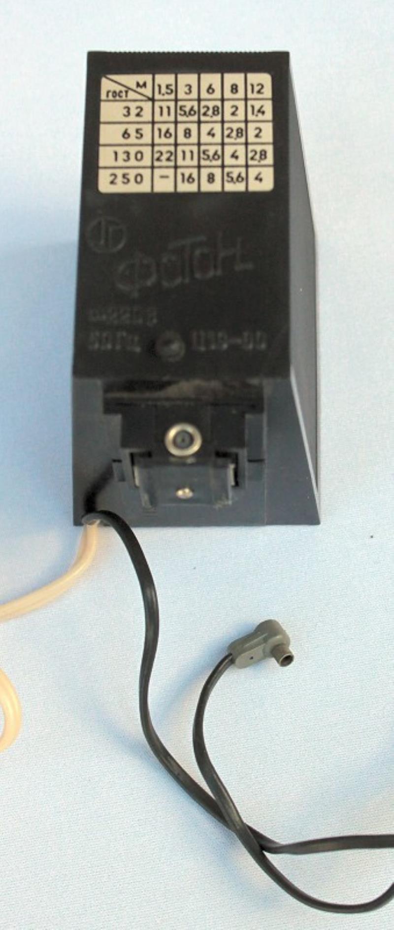 The Foton electronic flash unit was made in Kharkov in the 1980s. It uses a 220 volt mains electricity supply and has a guide number of 32 for 130 GOST film. It has a lead for a camera PC socket, which can be plugged into the back of the accessory shoe, converting it to a hot-shoe. It is supplied in a plastic fitted case.